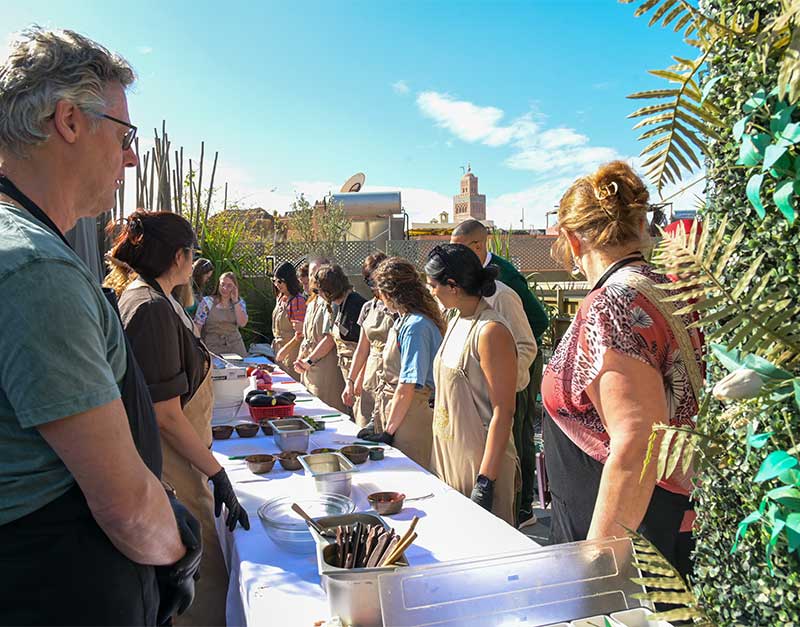 Join Chef Hassan on our rooftop for intimate cooking classes where you'll learn the secrets of Moroccan cuisine. Start with a morning market tour through the medina's souks, selecting fresh ingredients and learning about spices. Return to Kachkech to prepare a three-course meal: traditional salads, a tagine of your choice, and Moroccan pastries.